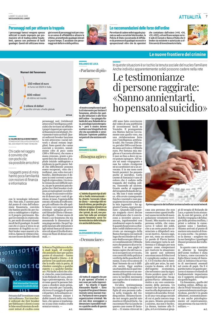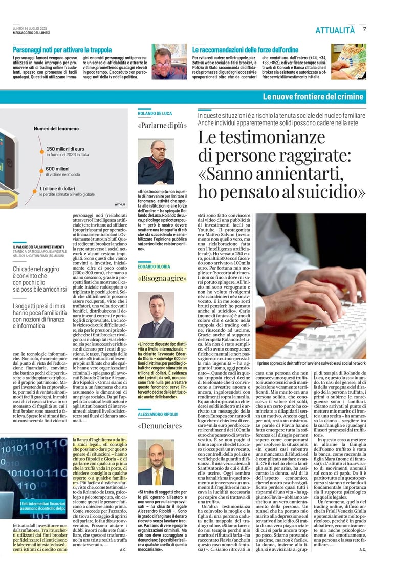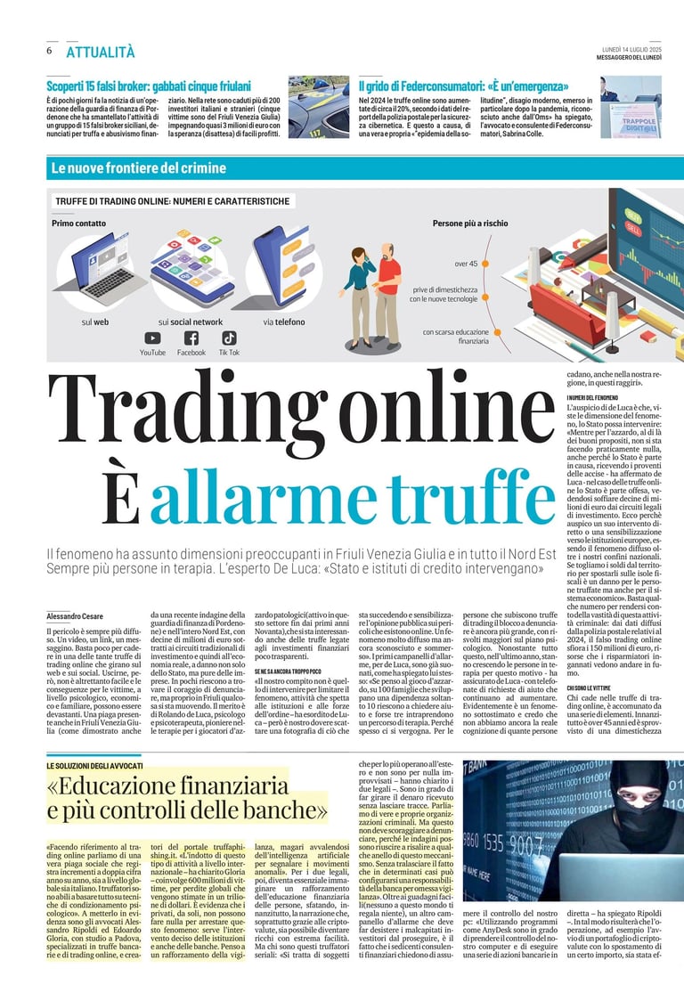 Intervista sul fenomeno delle truffe finanziarie via web e social, educazione finanziaria e tutela legale delle vittime.